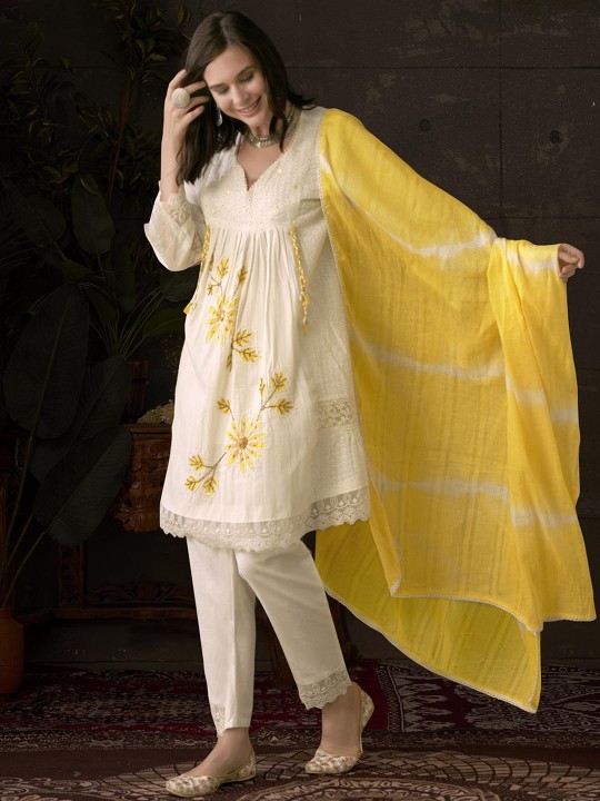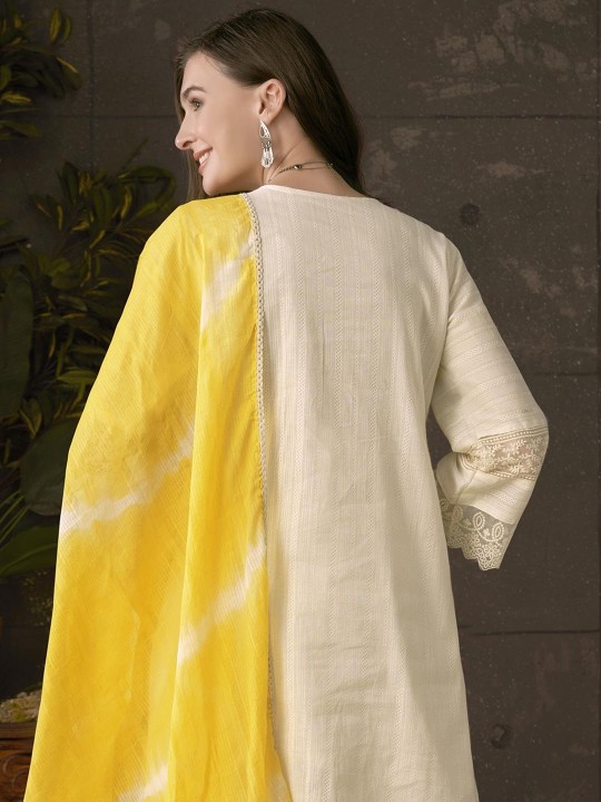 Cream & yellow embroidered Kurta with Trousers & dupatta
